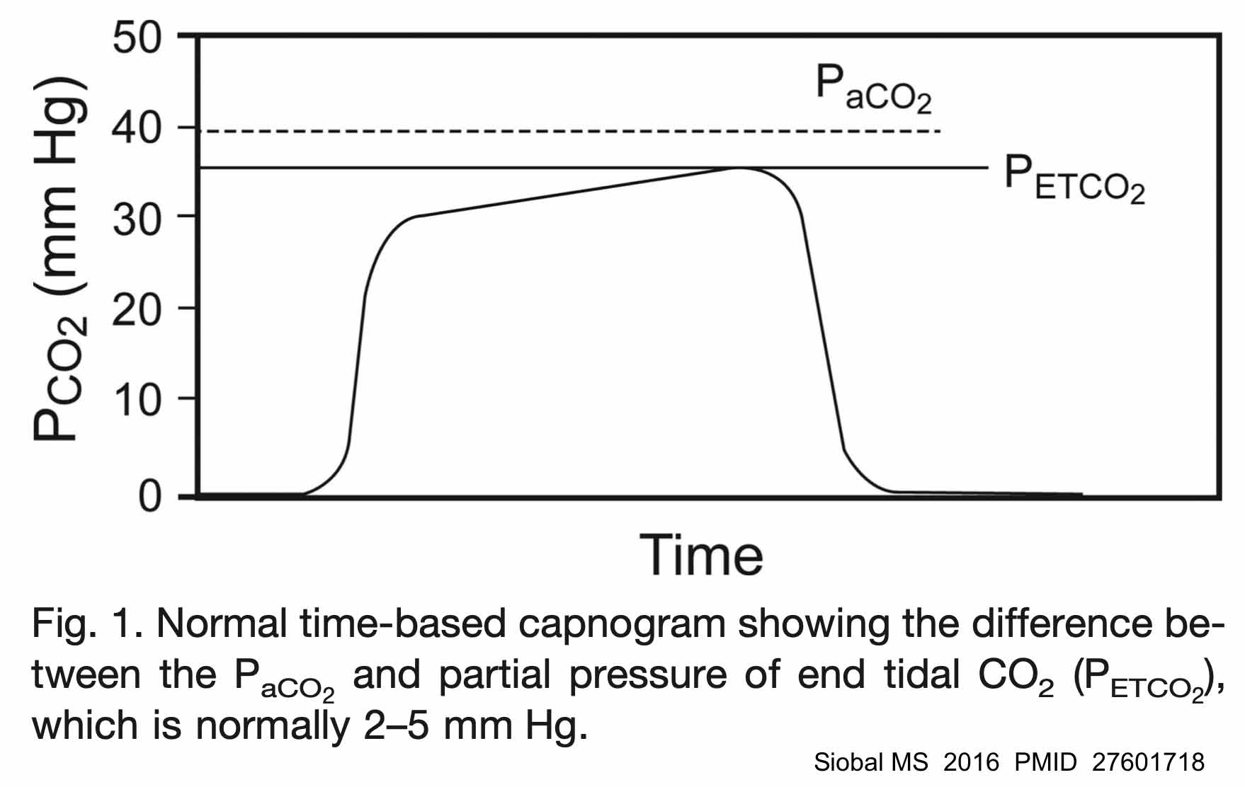 An end-tidal capnography waveform measures and displays the peak amount of CO at the end of exhalation. An increase of EtCO2 to normal values 35-45 mm Hg or an increase by 10 mm Hg is about 97 specific. The gradient is the difference between the arterial carbon dioxide partial pressure PaCO 2 and the etCO 2 partial pressure is a result of the relationship between ventilation and perfusion or rather ventilation-perfusion matching VQ.